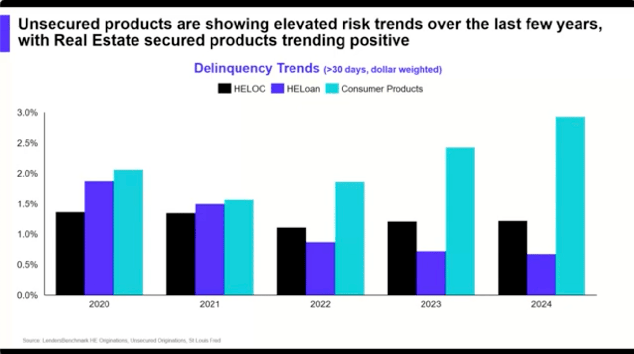 They see delinquency rates declining for HELOCs and HELoans, and that’s been the case for the last four years. Over half of the borrowers with home equity products have credit scores above 780. This indicates a conservative approach by lenders, limiting risk and contributing to stable performance. “There’s a much lower credit risk tolerance versus the unsecured side.”