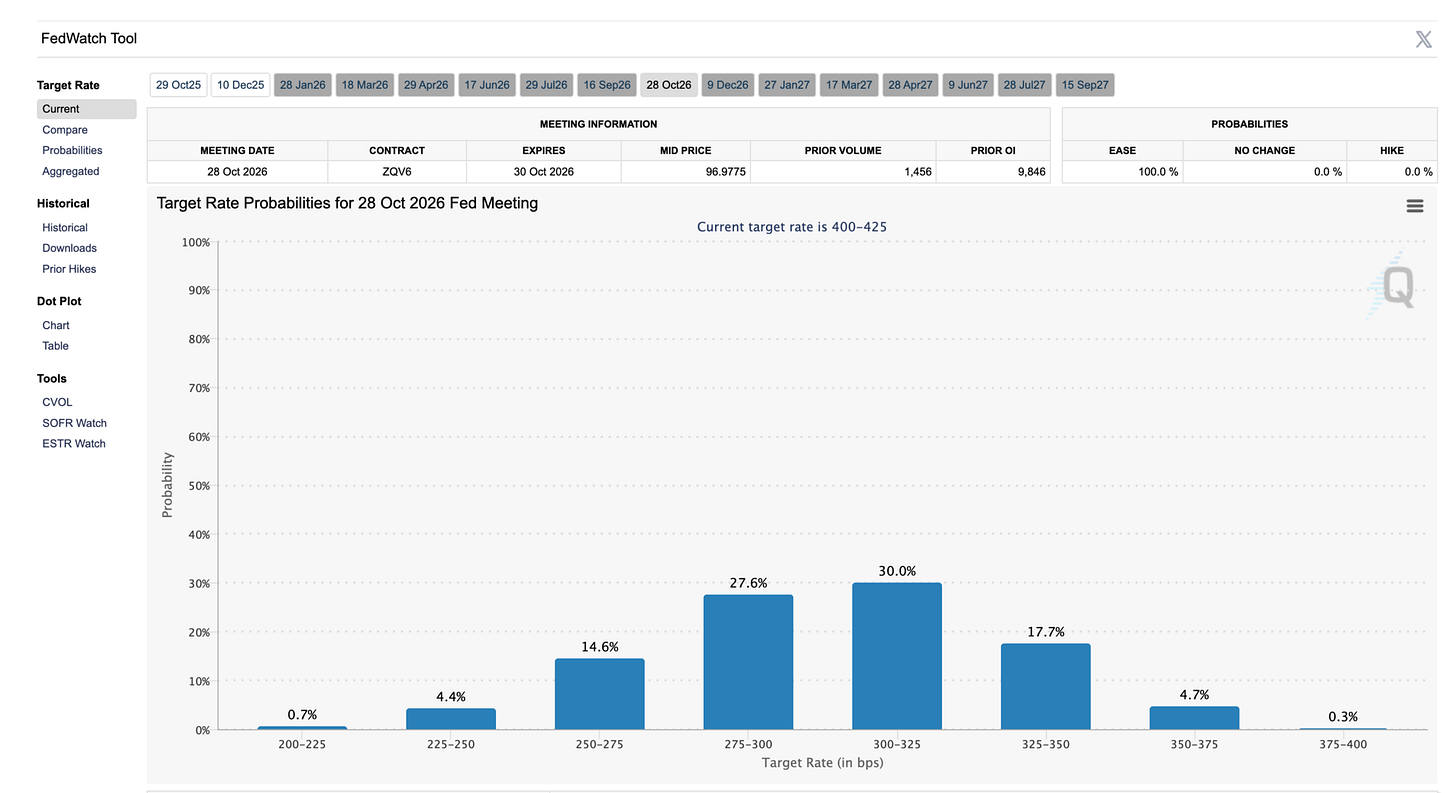 First, it’s a near certainly (97.8%) that the Fed will cut rates by 25 bps at its next meeting on October 29th, 2025 (that’s tomorrow!).