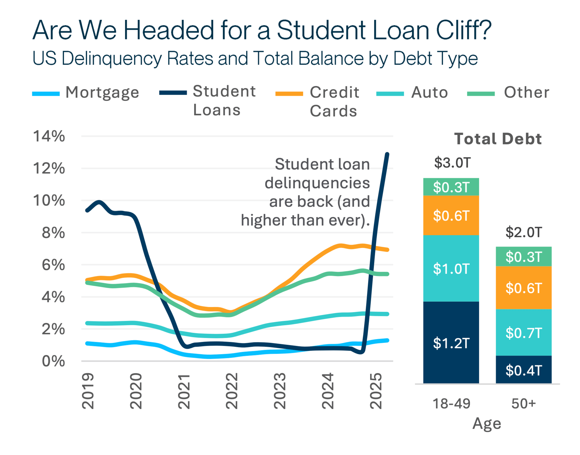 2. High delinquency rates (12%+) in the student category is a reason for lenders to be cautious with new originations.