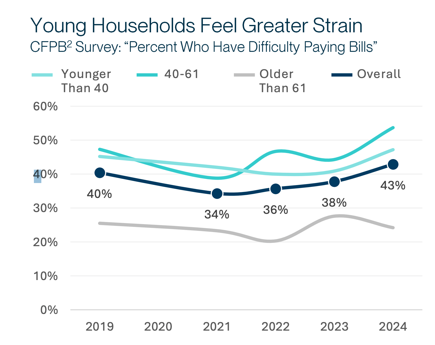 The CFPB’s survey, though a little dated, is showing increasing financial strain among households less than 61 years old.