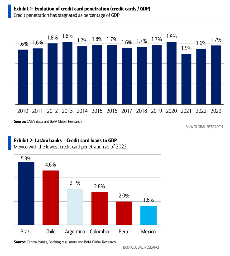 Low penetration rate: Mexico has only 48 million credit cards, equating to one card for every two adults.