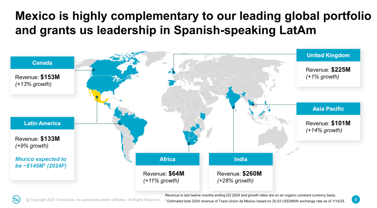 (1/16) TransUnion plans to expand in Latin America by acquiring a 68% stake in Mexico's Buró de Crédito consumer credit business for $560 million, boosting its ownership to 94%. Already a key player in Buró's operations, TransUnion aims to enhance financial inclusion and leverage its global technology to expand into areas like FinTech and insurance. This move positions TransUnion as the leading credit bureau in Spanish-speaking Latin America, with expected 2024 revenue of $145 million from the acquisition. The deal is set to close by the end of 2025, pending approvals. [TransUnion] [Deal Presentation]