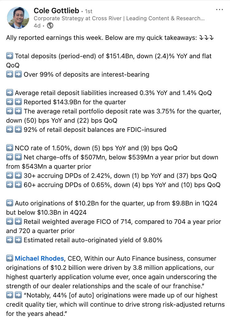 Michael Rhodes, Ally CEO: “Ally delivered solid first quarter results, reflecting continued momentum across our market-leading franchises – Dealer Financial Services, Deposits, and Corporate Finance.” [Ally - Q1 2025]