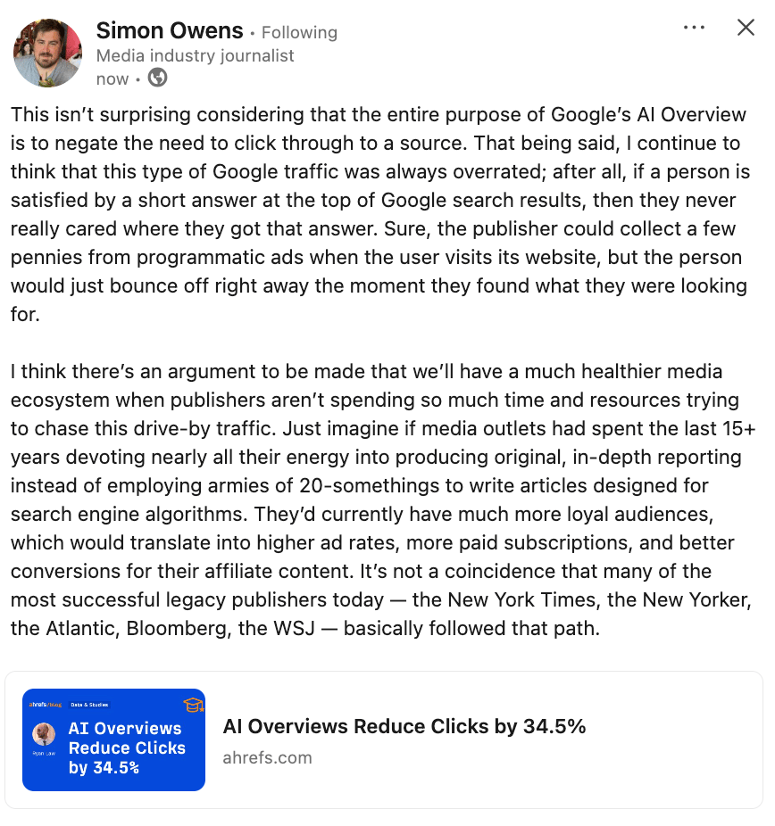 Simon Owens, a media industry expert, shares his thoughts on why “AI Overviews Reduce Clicks by 34.5%”