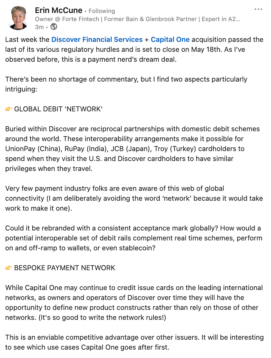The acquisition unlocks the potential to leverage Discover's hidden global debit partnerships (like UnionPay, RuPay) into a more unified international payment system.