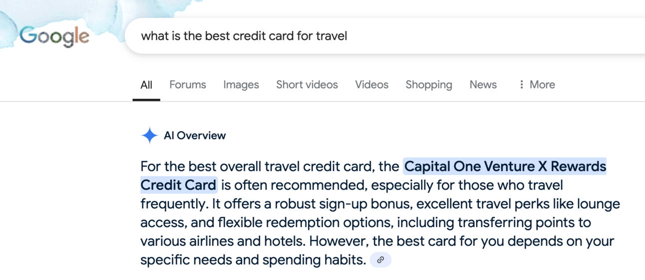 And, for what it’s worth, Google’s AI Overview definitely hits home. A simple search of “what is the best credit card for travel” returns the Capital One Venture X Rewards Card. I’m sure some members of the Toaster community will have very strong views for and against this. Either way, apparently that’s what Google’s AI thinks, and if the Ahrefs article is true, it might not be as big of a deal as some would think.