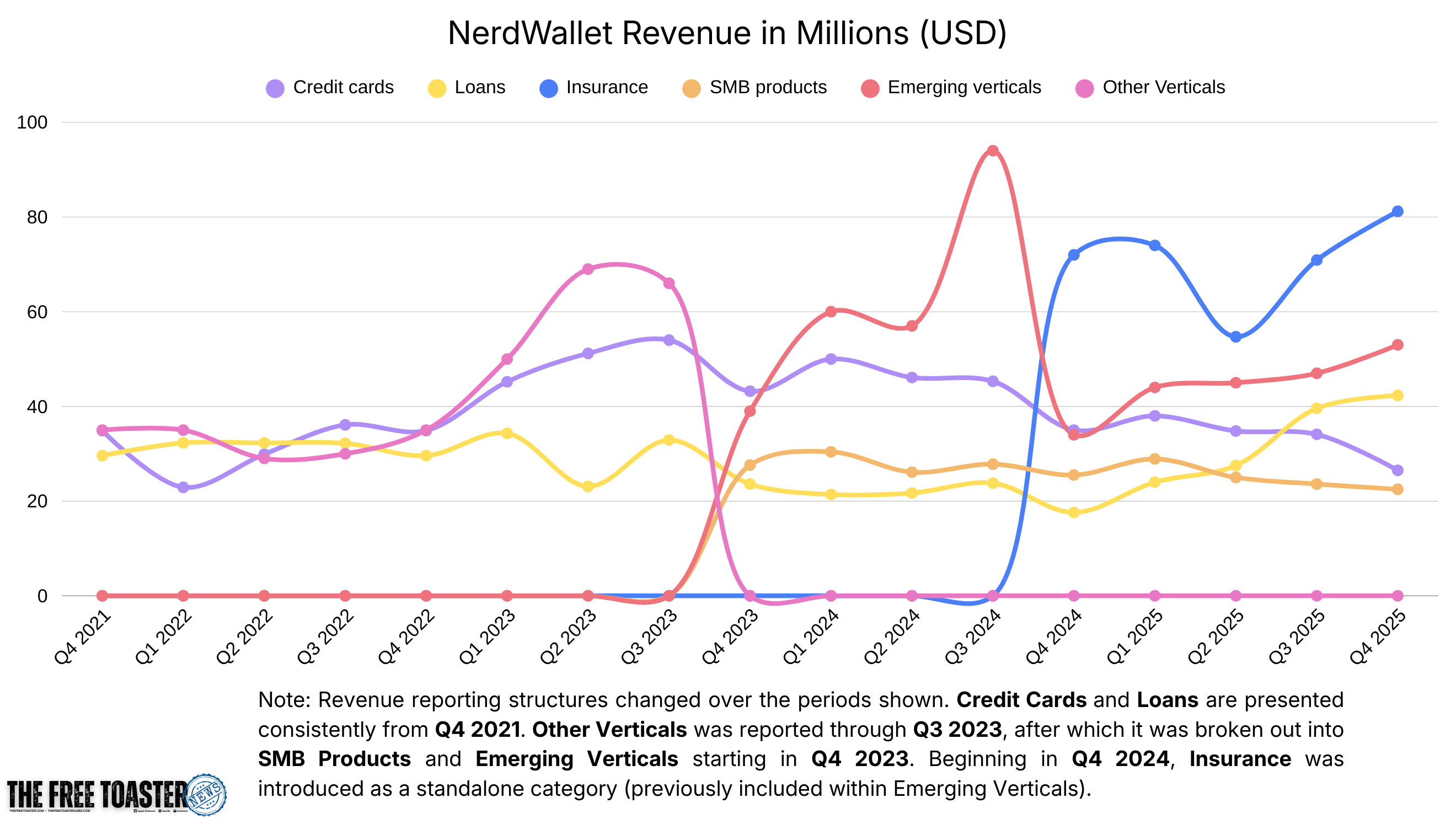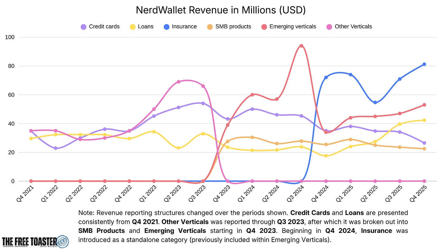 The credit cards decline is about what you’d expect. Organic search headwinds have been hitting the category hard, and NerdWallet hasn’t been able to make up the difference in paid media. That’s partly because paid search in the cards vertical is ruthlessly competitive, and NerdWallet is still developing its muscle there. What makes it sting a little more is the broader context: lenders we talk to are actually growing in affiliate channels in cards right now. This isn’t a category that’s rolled over. NerdWallet is losing ground in a market that’s still very much alive.
