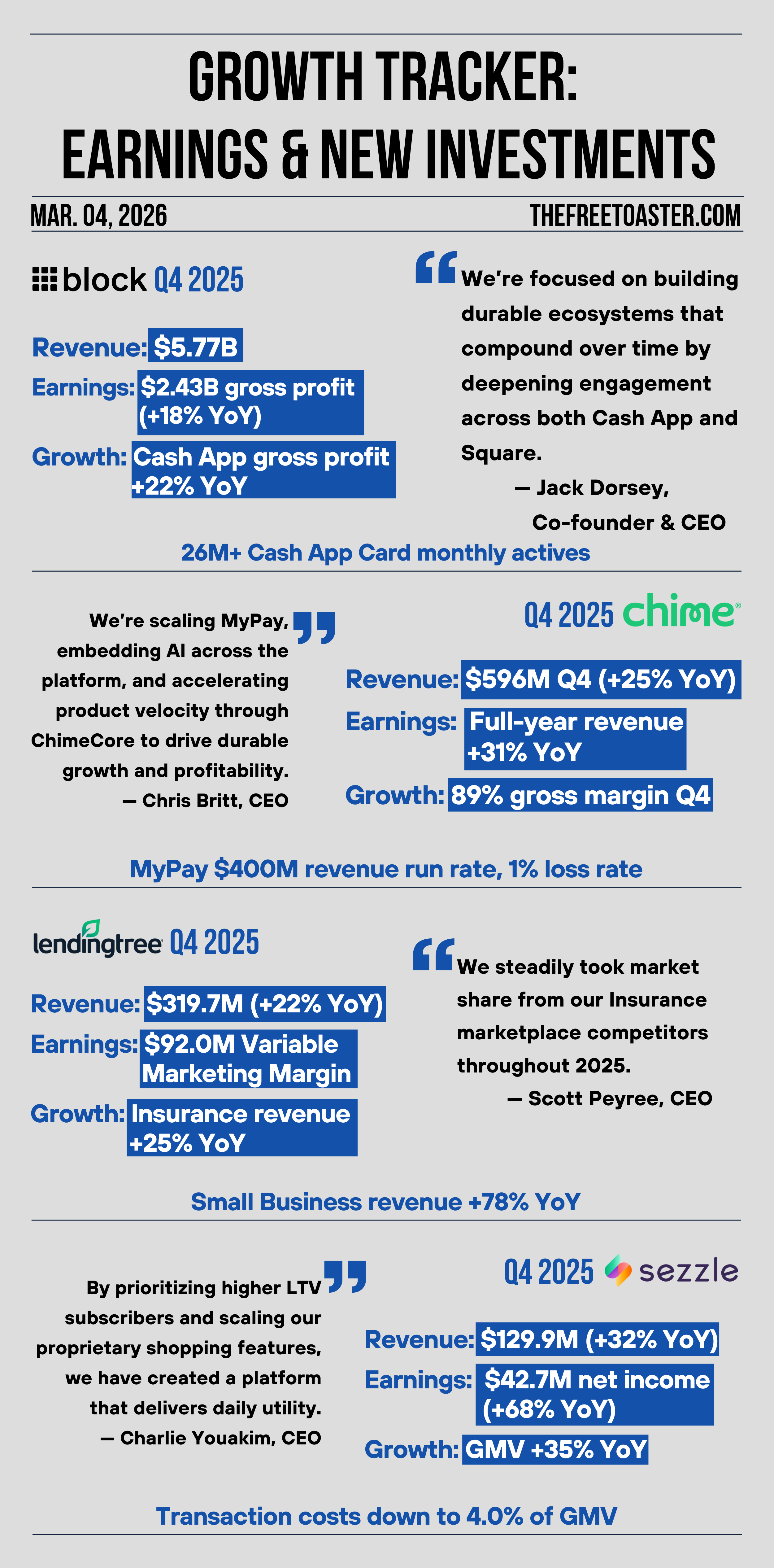 We’ve got a packed edition headlined by NerdWallet’s growth paradox, hitting record revenue of $836.6 million even as AI-driven search erosion poses an existential threat to their core model. The AI disruption continues at Block, which is cutting its workforce by 40% in a massive bet on smaller, automated teams. In payments, the landscape is shifting as Stripe expresses interest in acquiring veteran incumbent PayPal, while Klarna surges to 55 million monthly users in its evolution toward becoming a global digital bank. We’re also breaking down Bilt’s new rewards for mortgage spending and a sobering Equifax report showing U.S. consumer debt has accelerated to $18.20 trillion.