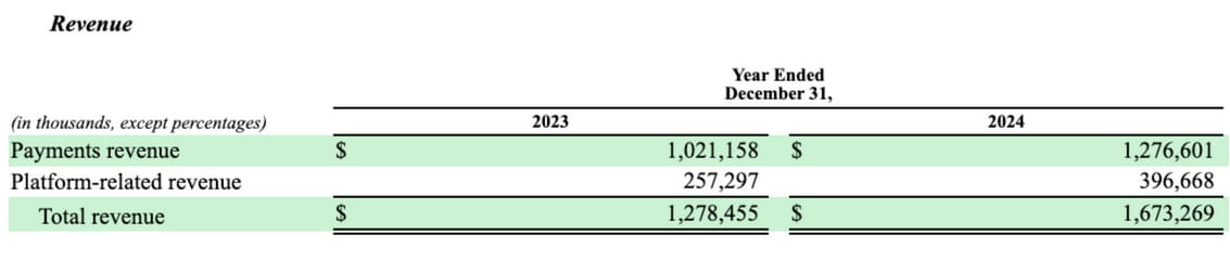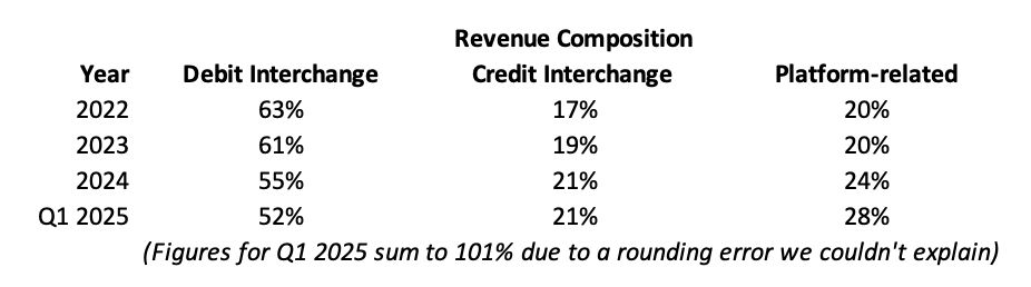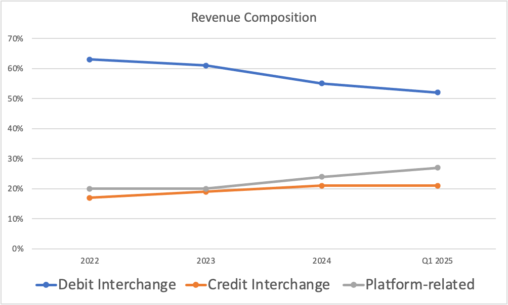 Although a smaller portion of volume (16% in Q1 2025), credit card transactions generate higher interchange rates and significantly impact revenue, with credit interchange (Credit Builder) making up 21% of revenue in Q1 2025. To put Credit Builder's impact in perspective, in 2024 alone, it generated $18.4 billion in Purchase Volume and $358.4 million in revenue.
