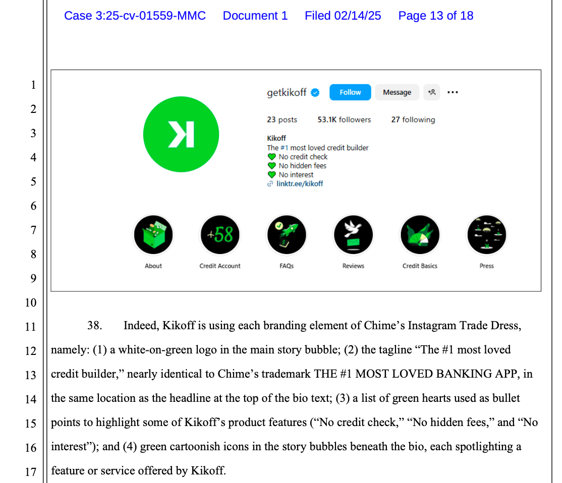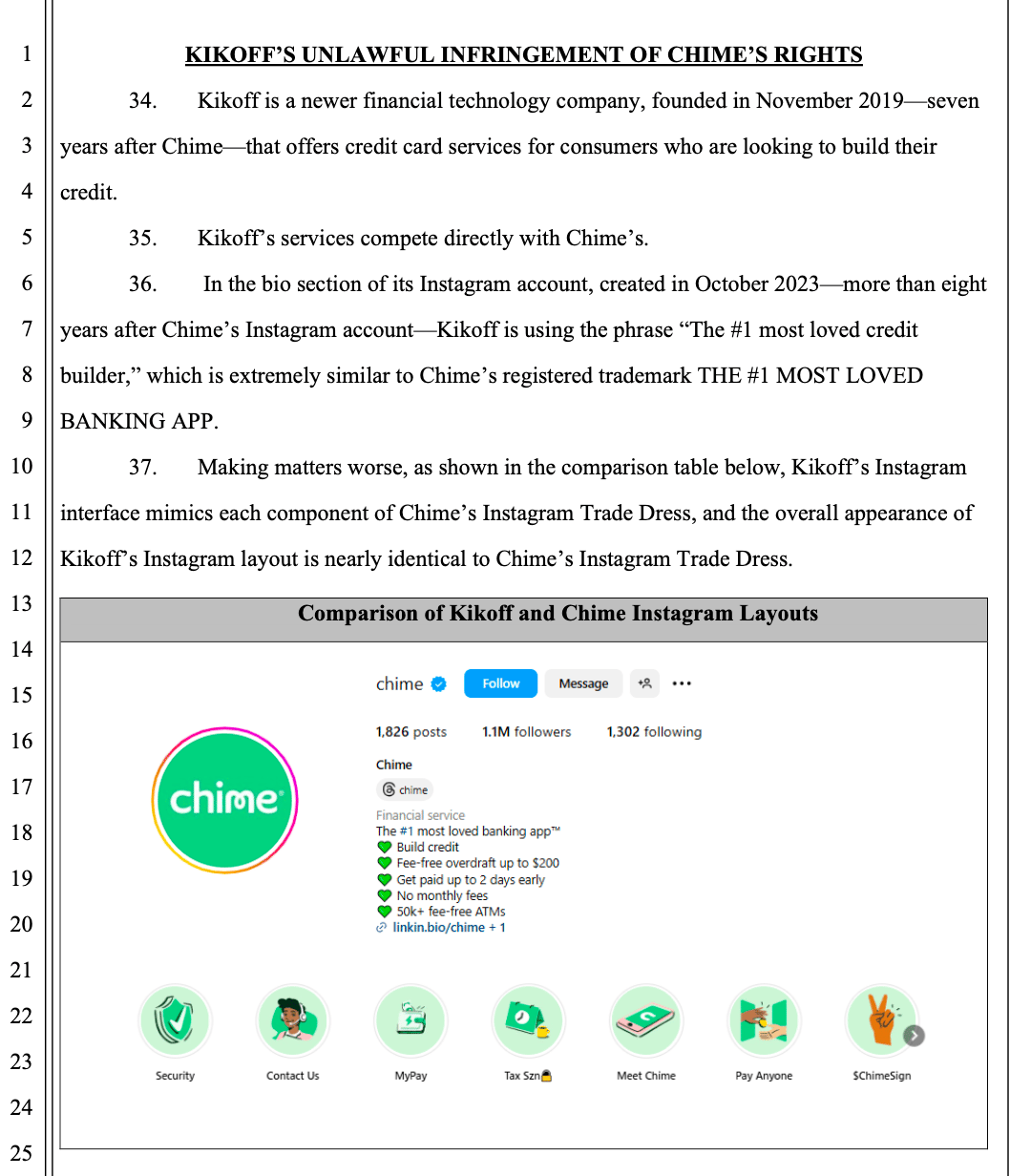 Chime Financial is suing Kikoff Inc. for trademark and trade dress infringement, claiming Kikoff copied its Instagram branding and tagline. Chime, a fintech company offering no-fee banking and credit-building services, alleges Kikoff's use of “The #1 most loved credit builder” closely mimics Chime’s registered trademark, “The #1 most loved banking app.” Chime also argues that Kikoff's Instagram layout, color scheme, and design elements are nearly identical to its own, misleading consumers into thinking the two companies are affiliated. The lawsuit seeks an injunction, damages, and legal fees. [San Francisco Business Times]