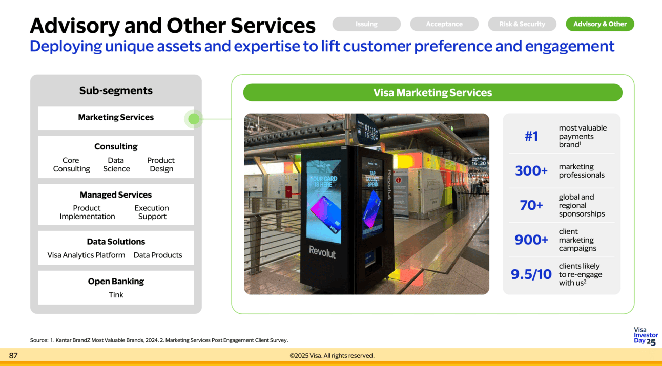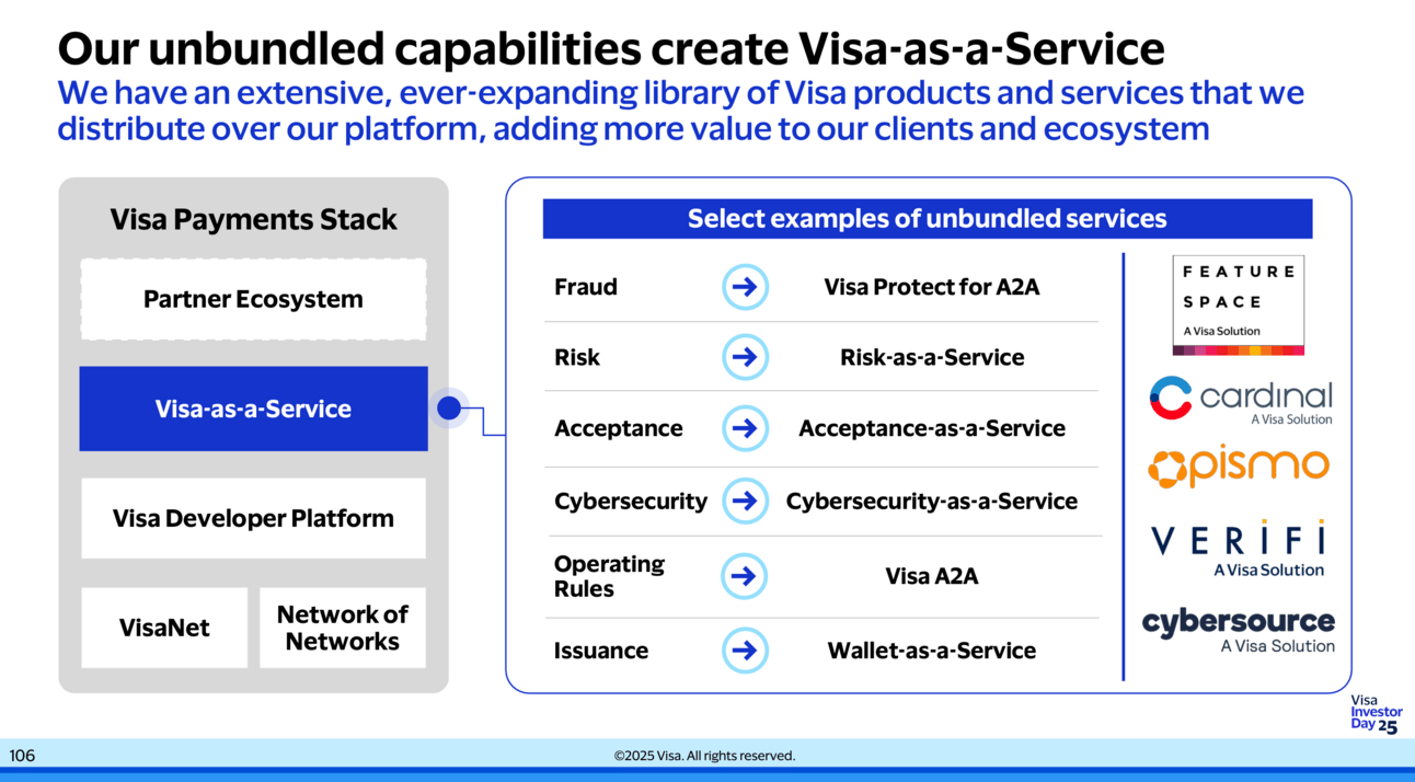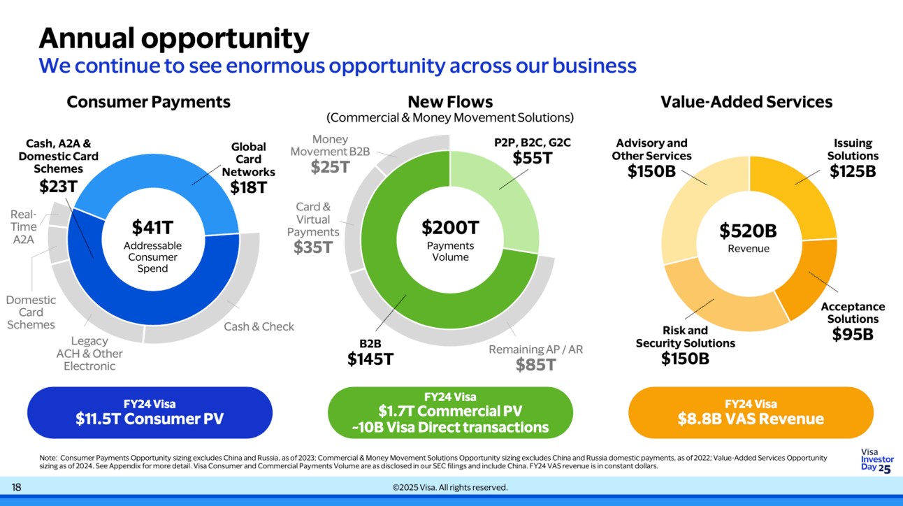 Visa outlined its growth strategy on investor day, emphasizing its expansion into under-penetrated markets and service-based revenue. The company is doubling down on its "Visa-as-a-Service" approach by unbundling its platform to support more payment types and clients. Value-added services (VAS), which make up 24% of revenue and are growing 20%+, are a key driver of Visa’s long-term outlook. While Visa didn't provide a formal financial forecast, it remains optimistic about achieving high single-digit to low double-digit revenue growth, fueled by its expanding services and new payment flows. [Visa Investor Day 2025]