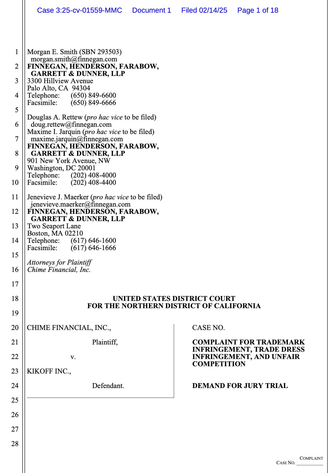 Chime Financial Inc vs Kikoff Inc - Case 3 25-cv-01559-MMC.pdf