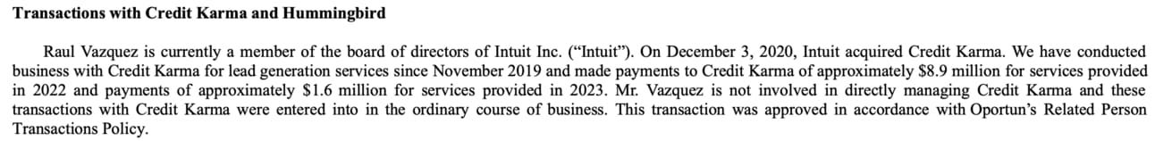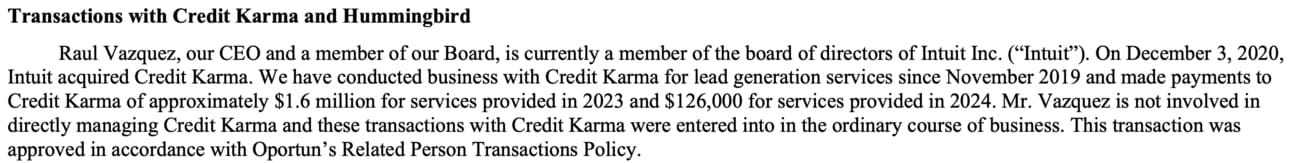 Digital Channels: The Oportun Mobile App and website are the primary funnels, supported by paid and organic online advertising. A key digital channel has been its lead generation partnership with Credit Karma. This relationship highlights the interconnected nature of the fintech ecosystem, as Oportun's CEO, Raul Vazquez, also sits on the board of Intuit, Credit Karma's parent company. However, the scale of this partnership appears to have shifted. Payments from Oportun to Credit Karma have declined, from $8.9 million in 2022 to $1.6 million in 2023, and further to just $126,000 in 2024, indicating a de-emphasis of this channel as part of the company's evolving strategy.