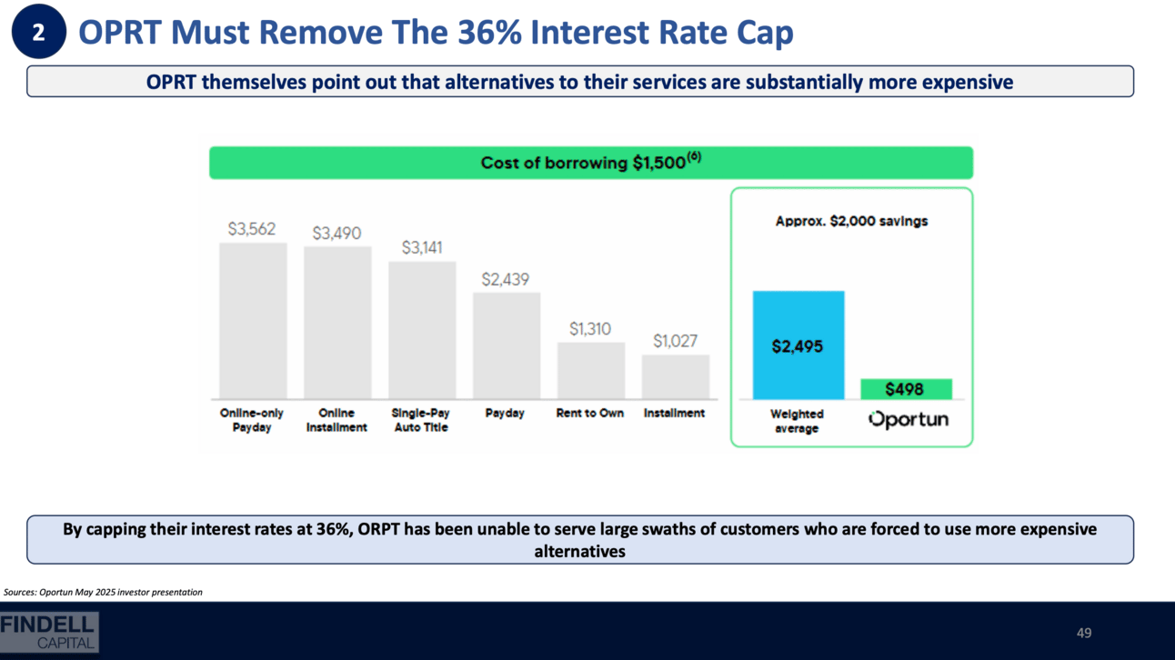 A Controversial Strategic Recommendation: Remove the 36% Rate Cap: Perhaps Findell's most contentious argument is that Oportun should abandon its long-standing policy of capping all loan interest rates at 36% APR. Findell claims that "By capping their interest rates at 36%, OPRT has been unable to serve large swaths of customers who are forced to use more expensive alternatives." They point out that Oportun itself highlights that its competitors are substantially more expensive, implying Oportun could charge more and still be a better option.