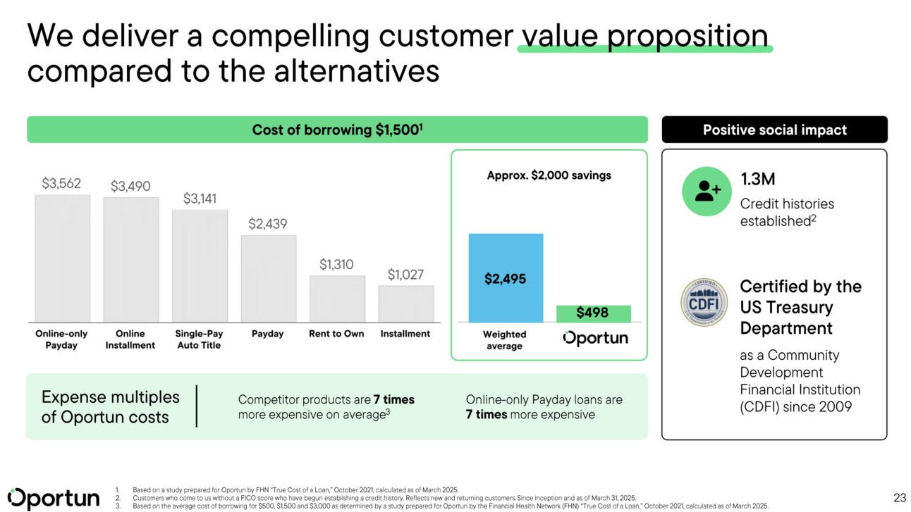 This mission is also a core part of its value proposition. Oportun claims its loans are, on average, "7 times less expensive" than alternatives like payday or pawn loans. This is based on a study commissioned by the Financial Health Network, which estimated that Oportun's members saved over $478 million in interest and fees in 2023 alone by choosing Oportun over those higher-cost options.