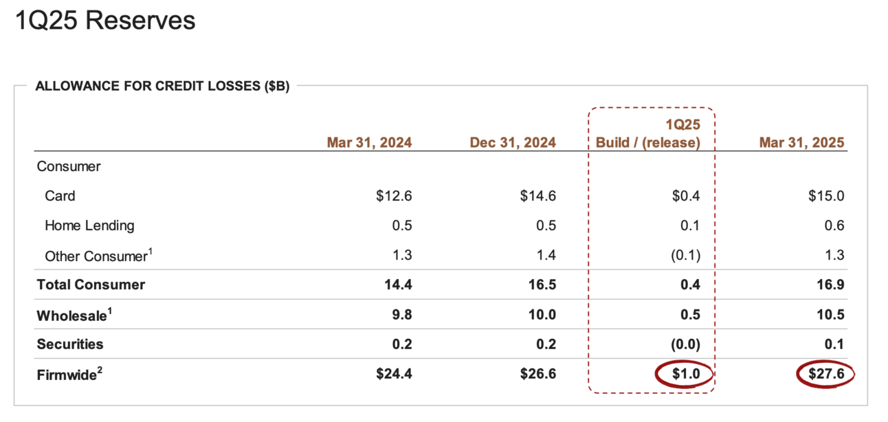 J.P. Morgan's credit and debit card volumes are losing steam, while its reserve for card losses is growing—signaling a more cautious stance as economic uncertainty looms. An earnings presentation showed pressure on consumers, with card spending growth slowing to 7% in Q1, down from 8% in Q4, as many were “front-loading” purchases ahead of now-active tariffs. The bank bumped up its loan loss provisions with a $973 million reserve build and raised its unemployment forecast to 5.8% for the year. While credit performance is still in line with expectations, CEO Jamie Dimon warned of a “wide range of scenarios” driven by inflation, trade policies, and market volatility. [PYMNTS]