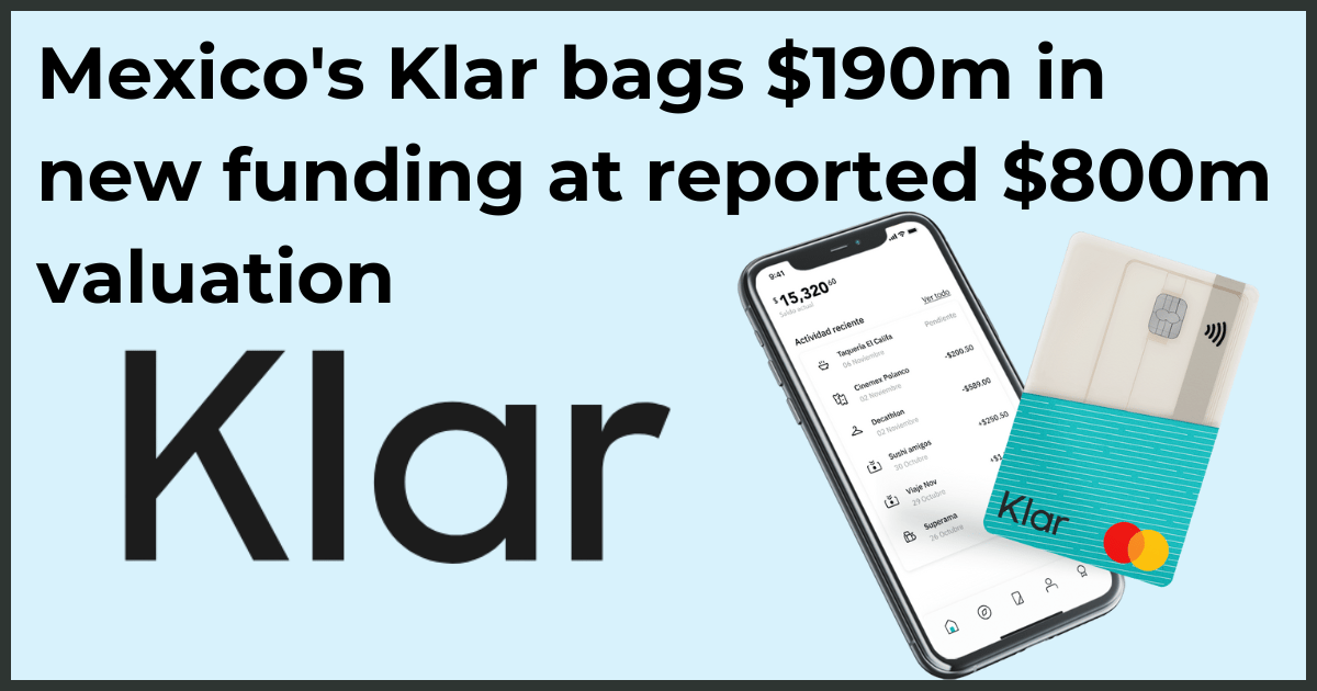 Mexican fintech Klar just bagged $190 million in new funding, pushing its valuation to a reported "$800 million". The credit services provider, which serves more than two million users in Mexico, raised "$170 million in equity and $20 million in venture debt" to fuel product development and further expansion. The round was led by returning investor General Atlantic, with participation from new backers like Santander Group and Grupo Televisa. [Fintech Futures] [Bloomberg]