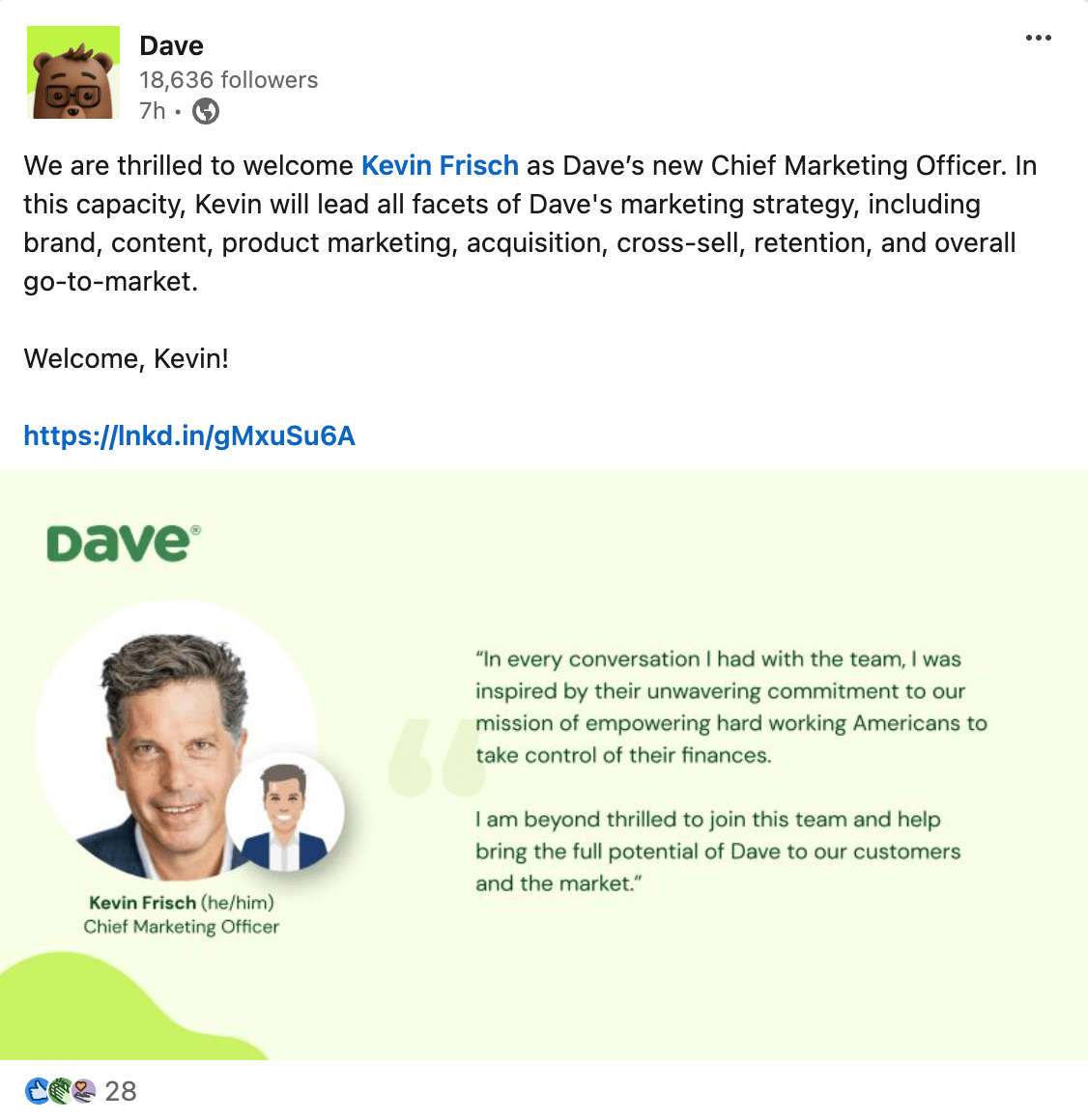 (11/19) Dave, a personal finance app specializing in cash advances and checking accounts, snagged Kevin Frisch as its new marketing chief. Frisch, with a resume that boasts roles at Intuit, Wag!, and Uber, steps in at a crucial moment as Dave faces FTC allegations of misleading advertising about instant cash advances and hidden fees, a controversy they dismiss as "regulatory overreach."