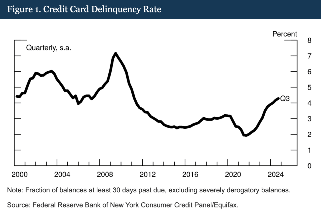 The Federal Reserve analyzed rising credit card delinquency rates and found that they’ve climbed 125 basis points since early 2023, largely due to increased lending to riskier borrowers and higher debt levels. Using a model based on interest rates, unemployment, credit card debt, and bank lending standards, researchers predicted a 120-basis-point rise—closely matching actual data. However, the model underestimated delinquency levels, possibly due to pandemic-era "credit score migration," which temporarily boosted consumer credit scores without improving underlying financial health. The report also notes that delinquency rates could continue to climb if borrowers accumulate more debt or the broader economy weakens—through rising unemployment or tighter credit conditions. [The Federal Reserve]