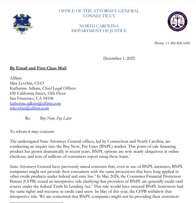 BNPL is booming at the exact moment scrutiny is tightening. Holiday spending hit $10.1 billion from Nov. 1 to Dec. 1, the highest Adobe has ever tracked, with Klarna reporting a 45% jump in volume and Block seeing a 10% lift across Afterpay and Cash App. Adyen and Fiserv also processed more payments than last year. At the same time, seven state attorneys general sent sweeping information requests to Affirm, Klarna, PayPal, Afterpay, Sezzle, and Zip. The letters ask for underwriting policies, dispute procedures, credit reporting practices, delinquency data, and even screenshots of checkout flows. The inquiry, illustrated in the Connecticut and North Carolina letter to Affirm, reflects growing concern that rising BNPL use is outpacing consumer protections especially after the CFPB walked back its rule that would have treated BNPL like credit cards. The contrast is sharp. Demand is surging, delinquencies are climbing, and regulators are stepping in where federal standards are uneven. For fintech and lending teams, the message is clear. BNPL growth is no longer the headline. Governance and transparency are about to become the competitive edge. (Attorney General - Connecticut, Payments Dive, Payments Dive)