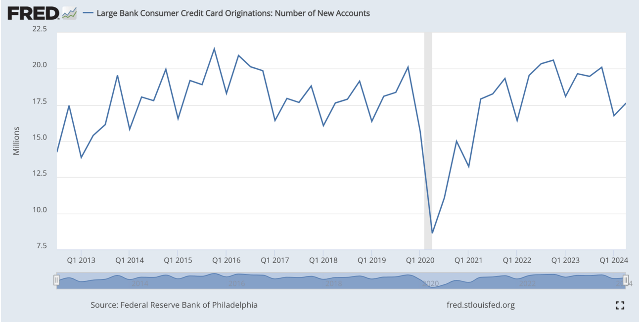 While the St. Louis Fed hasn't posted Q3 2024 numbers yet, their data shows that Q2 2023 origination volume (for large banks) was 19.65MM cards, while Q2 2024 was 17.63MM cards. That’s a 10% decline, roughly in line with NerdWallet’s YoY drop.