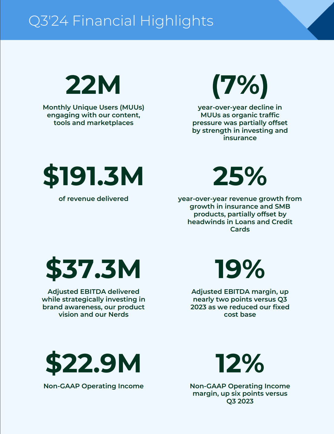 Q3 ‘24 Monthly Unique Users are at 22MM, down 7% YoY due to “broad organic traffic pressure.”