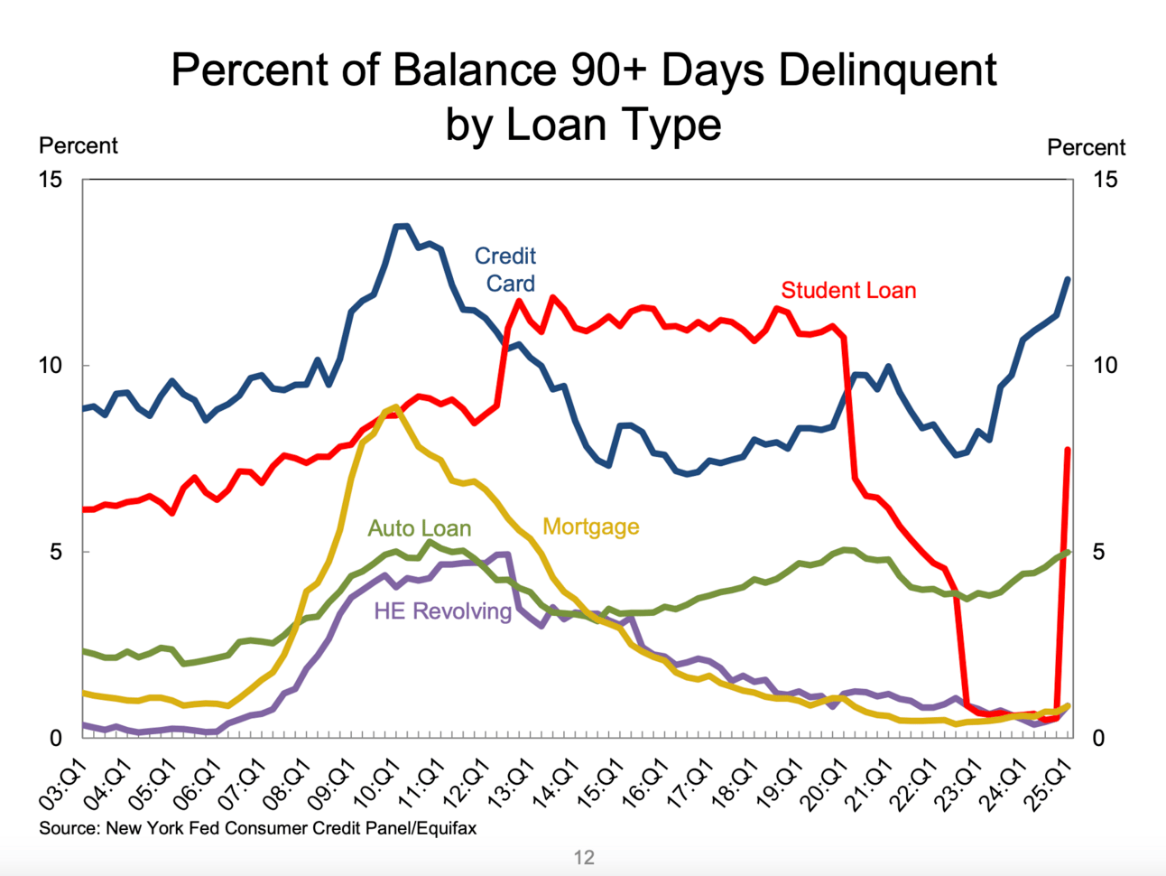Household debt climbed to a record $18.20 trillion in Q1 2025, up $167 billion from last quarter, according to the New York Fed. While mortgages (+$199B) and student loans (+$16B) rose, credit card and auto loan balances actually dipped by $29B and $13B, respectively. The big red flag? Student loan delinquencies surged, with 7.7% of balances now 90+ days late, after credit bureaus resumed reporting them post-pandemic. Meanwhile, overall delinquency ticked up to 4.3% of debt in some stage of late payment. [New York Fed Q1 2025 Household Debt and Credit Report]