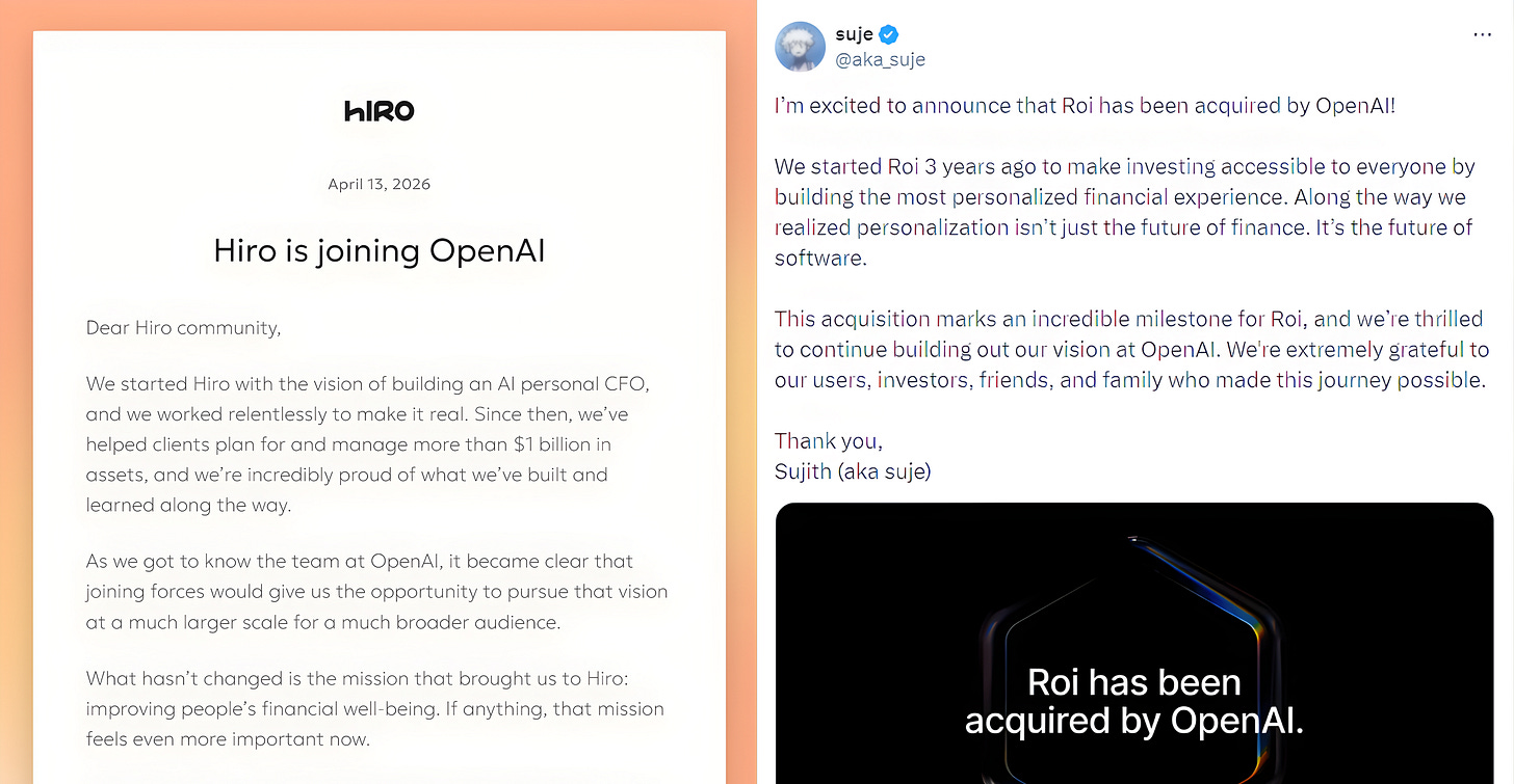 Hiro and Roi were not acquired because OpenAI wanted a budgeting app. They were acquired because both teams had figured out something specific: how to take messy personal financial data and turn it into a clear, actionable output. That’s a hard problem. Hiring for it in-house is harder.