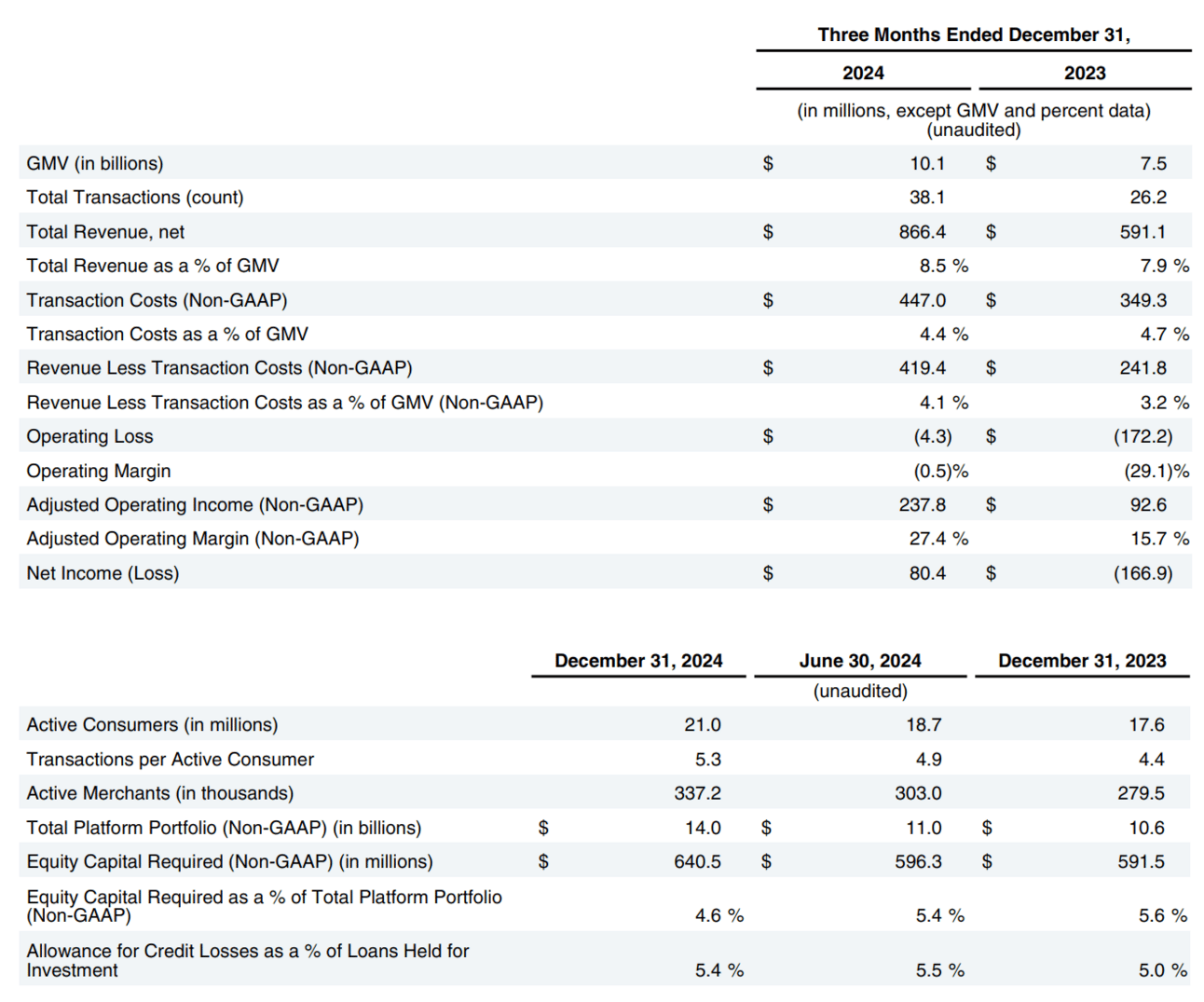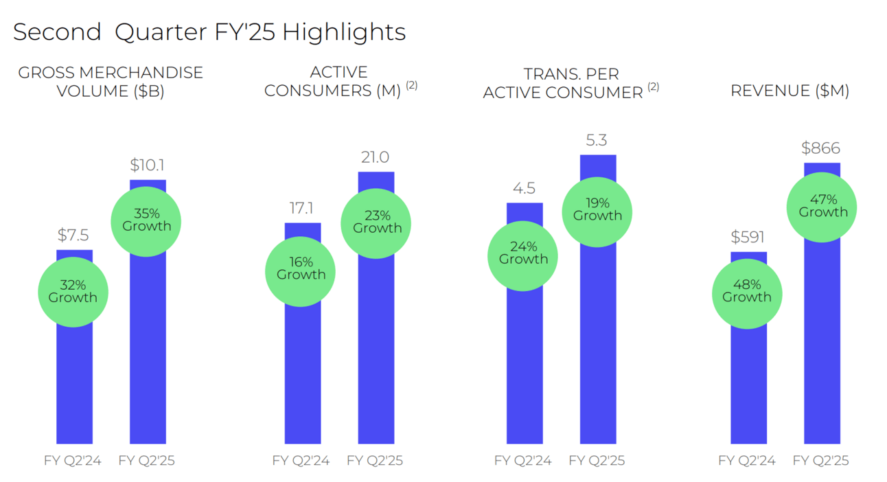 Affirm, the buy-now, pay-later (BNPL) firm, reported strong Q2 results as active consumers jumped to 21 million, fueled by a 35% GMV increase to $10.1 billion and a strong holiday shopping season. Revenue surged 47% to $866 million, while transactions per consumer climbed 22% to 5.3. The Affirm Card continued its rapid growth, with GMV up 113% and active users soaring 136% to 1.7 million. CEO Max Levchin reaffirmed the company’s goal of turning operating income positive within five months, as investors pushed shares up 12.8% in after-hours trading. [PYMNTS] [Affirm]