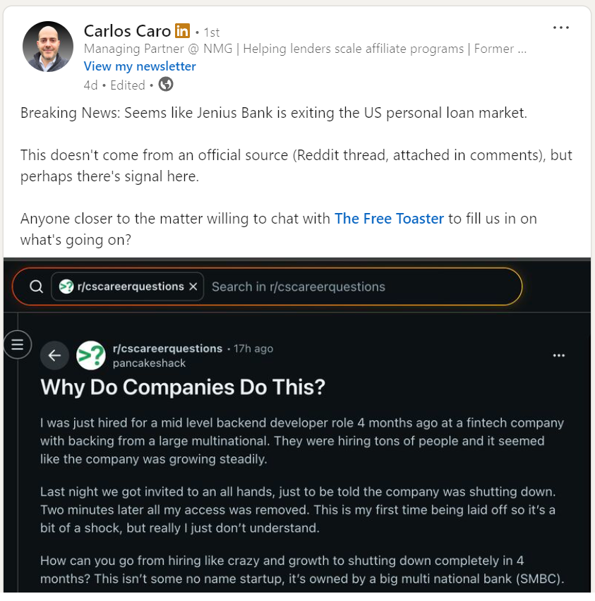 If you’ve been enjoying The Free Toaster, help us spread the word. Forward it to someone who lives and breathes consumer lending, marketing, or fintech like you do.