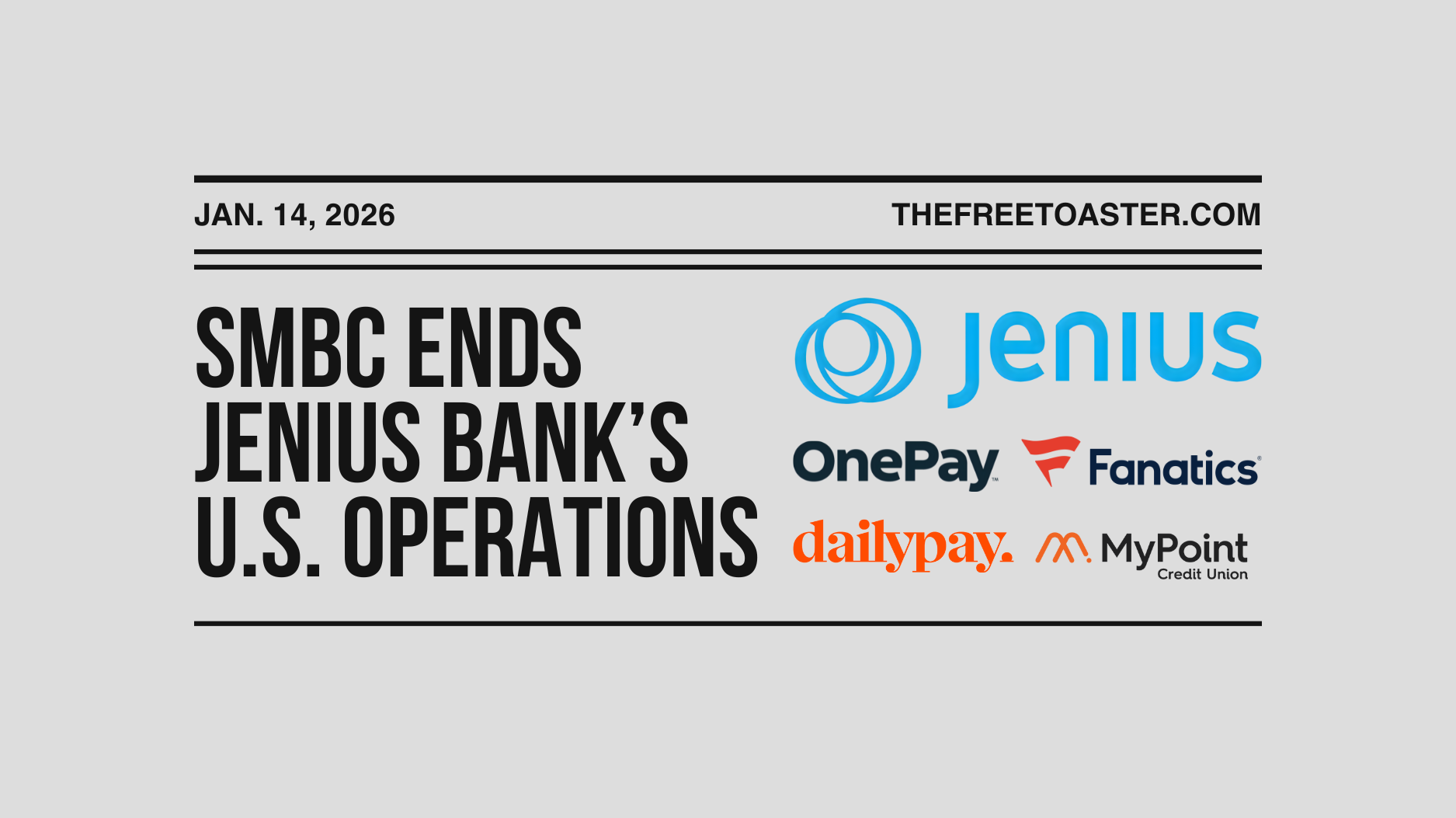 This week starts with SMBC winding down Jenius Bank, ending its U.S. digital consumer banking push just two and a half years after launch. Despite strong early deposit growth, the business never aligned with the profitability timeline its parent expected, reinforcing the broader pullback from bank-led, digital-only consumer models. Elsewhere, Fanatics is preparing to launch a credit card tied to merchandise, tickets, and betting, while Walmart-backed OnePay quietly crossed a $4 billion valuation, underscoring how embedded retail distribution can drive fintech scale without a new funding round.