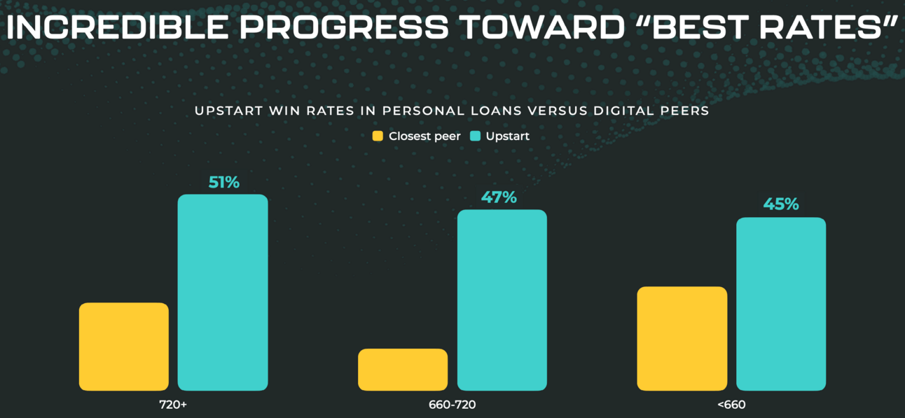 Price: Upstart indicates its underwriting models aim to reduce costs and credit losses. The company claims these models can result in a 36% reduction in APRs at comparable approval rates versus traditional methods. Rapport suggested that such differentiation can lead to "pricing power" and "positive selection," attracting lower-risk borrowers by offering competitive rates.