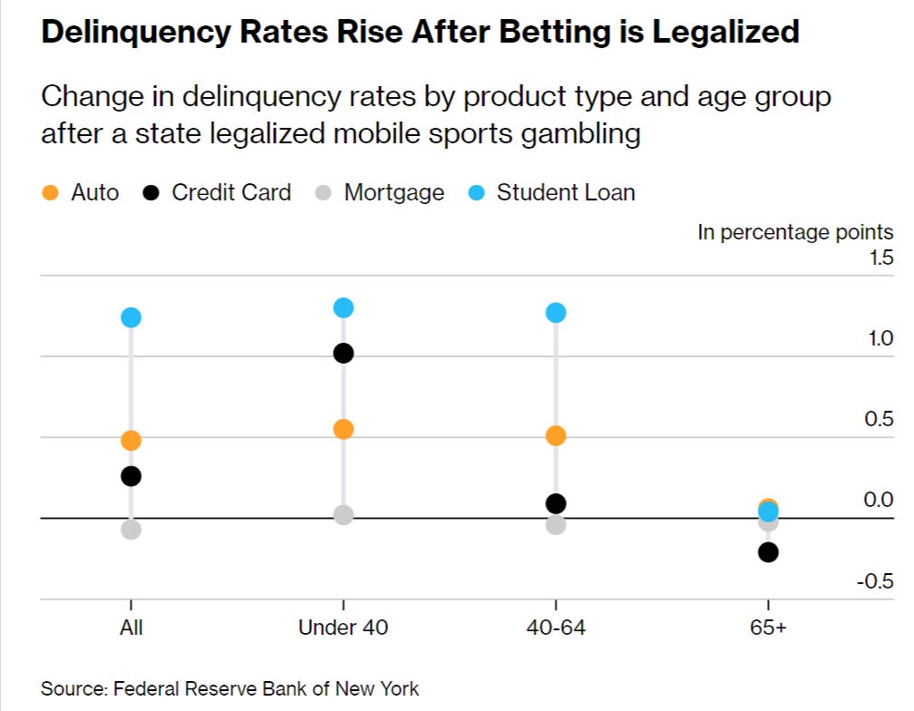 Under-40 credit card delinquencies rose 7.9% in states following sports betting legalization, according to a report from the Federal Reserve Bank of New York. The New York Fed found that auto loan delinquencies in the same age group increased by 5.6%. While only 3.1% of the population actively bets on sports after legalization, the financial impact is significant enough to lower median credit scores by 1 point across entire counties. Data suggests that for the specific group of individuals who take up gambling, delinquencies jump by approximately 10 percentage points. Younger bettors under 40 see a 26 percentage point spike in late payments. These findings align with separate data from the University of California Consumer Credit Panel showing legalization increases bankruptcy likelihood by 10%. The authors wrote that sports betting can have dramatic implications for household financial stability as access expands through mobile apps and prediction markets like Kalshi and Polymarket. (Bloomberg) (Federal Reserve Bank of New York)