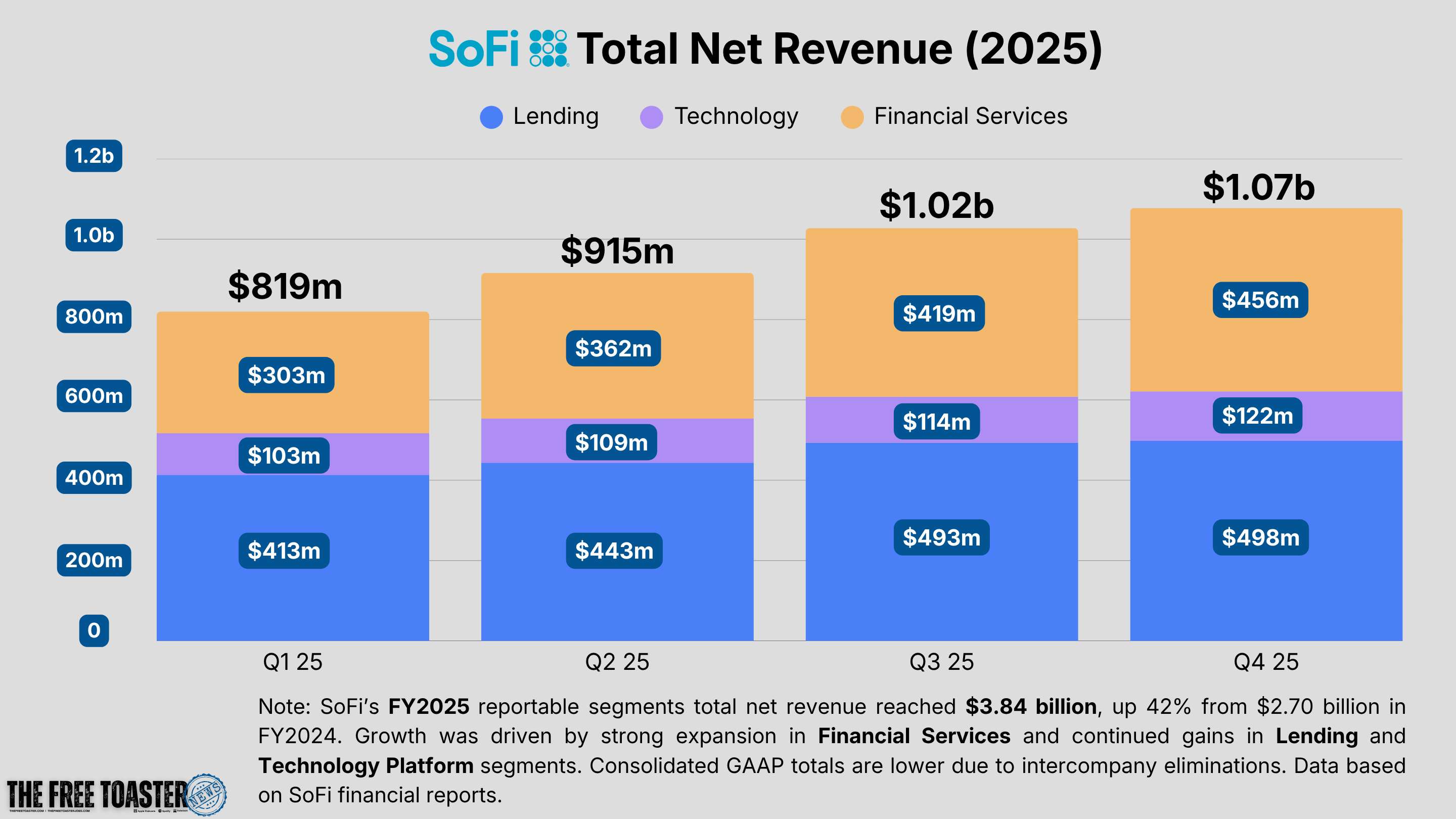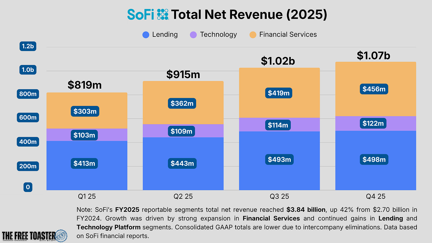 The LPB sits inside SoFi’s Financial Services segment and is a core driver of that segment’s growth, scaling from $303 million in Q1 2025 to $456 million by Q4. In FY2025, the Loan Platform Business accounted for more than 75% of Financial Services noninterest income, making it the segment’s dominant revenue driver by a wide margin.