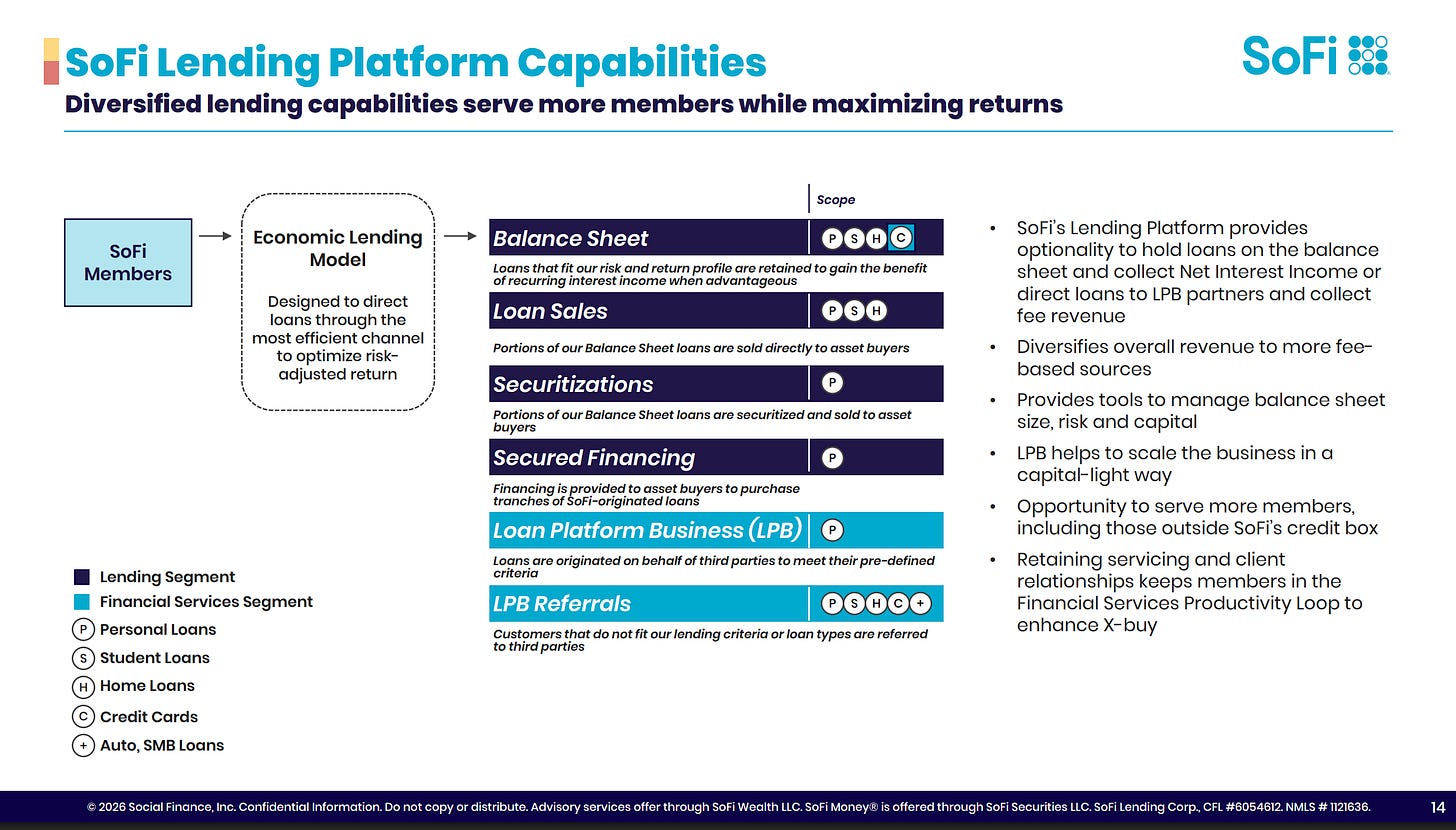 SoFi spends heavily on brand, stadium naming rights, national TV, celebrity partnerships. That spend drives significant borrower demand. The LPB is what ensures none of that demand goes to waste. SoFi originates on behalf of third parties, collects fees, and retains servicing rights without carrying the credit risk. CEO Anthony Noto framed it plainly: “By connecting strong borrower demand with institutional capital, we’re building a capital-light, fee-based business that complements our overall lending business while leveraging our existing technology platform capabilities in underwriting, pricing, marketing and servicing.”