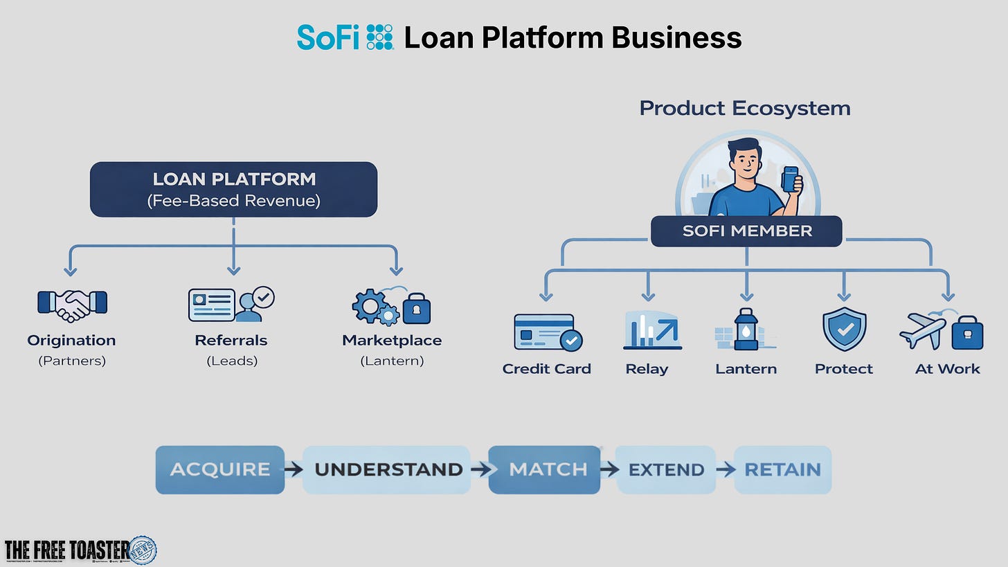 Not every borrower who comes to SoFi gets a SoFi loan. Some fall outside the credit box, meaning they don’t meet SoFi’s own underwriting criteria. That’s where the Loan Platform Business comes in. Instead of a dead end, those borrowers get routed to partners through referrals or the Lantern marketplace. SoFi still earns fee income and retains the servicing relationship. The marketing spend converts regardless of whether SoFi holds the loan.