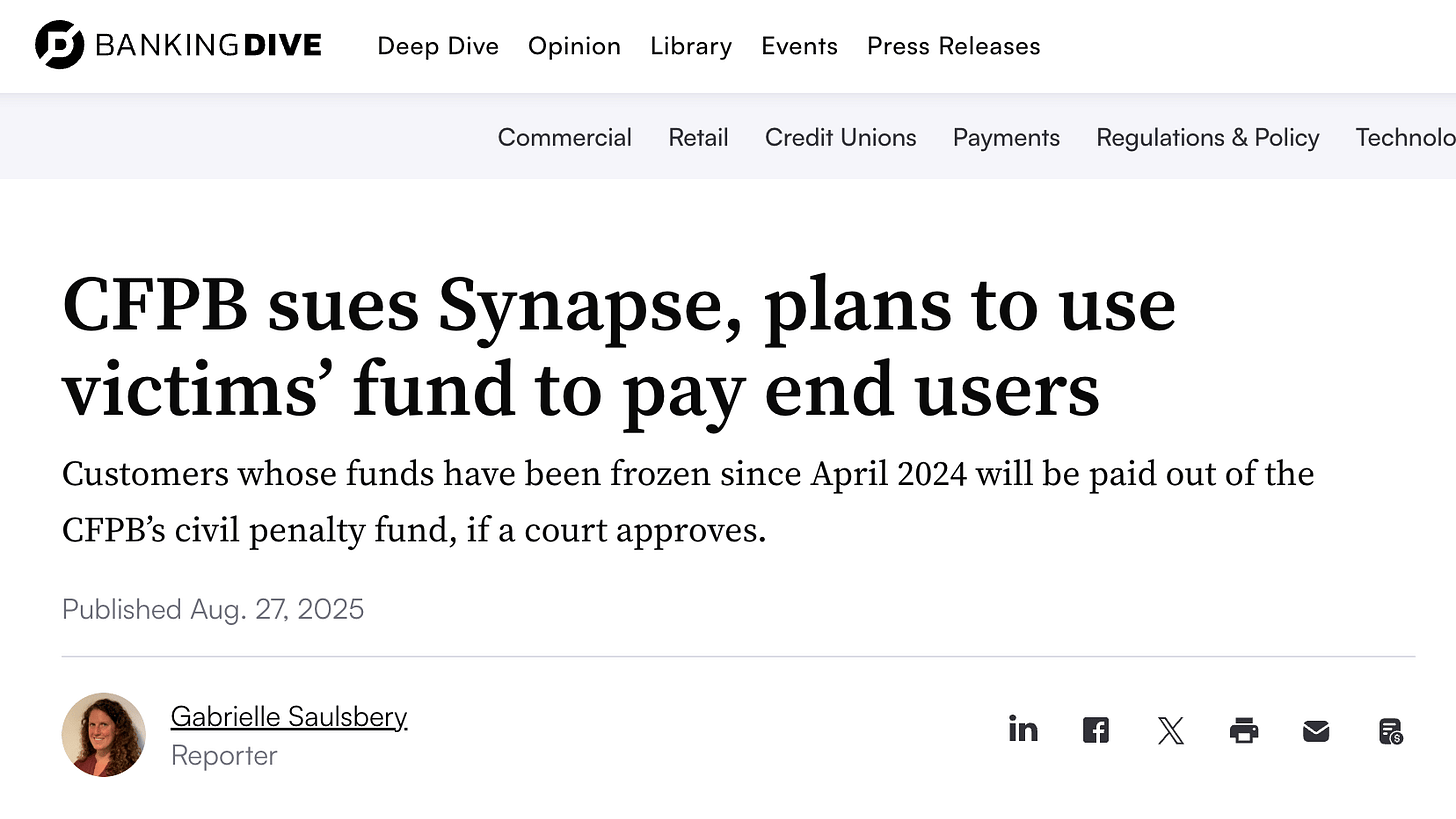 Source: https://www.bankingdive.com/news/cfpb-sues-synapse-plans-use-victims-fund-pay-end-users/758776/