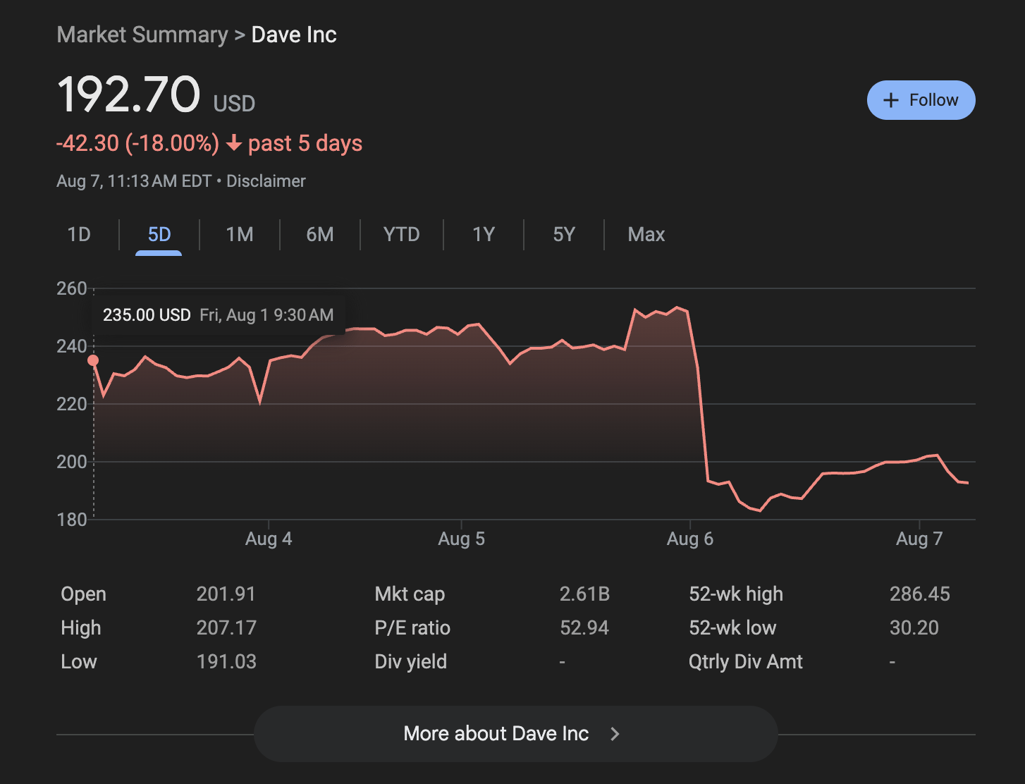 Despite these impressive results and the announcement of expanded banking partnerships, Dave's stock fell 13% in pre-market trading. Market reaction reflected concerns about the company's elevated valuation multiples and cooling investor enthusiasm following a substantial rally earlier in the year. The company raised full-year revenue guidance to $505-515 million, betting on continued product adoption and operational leverage. [Investing.com]