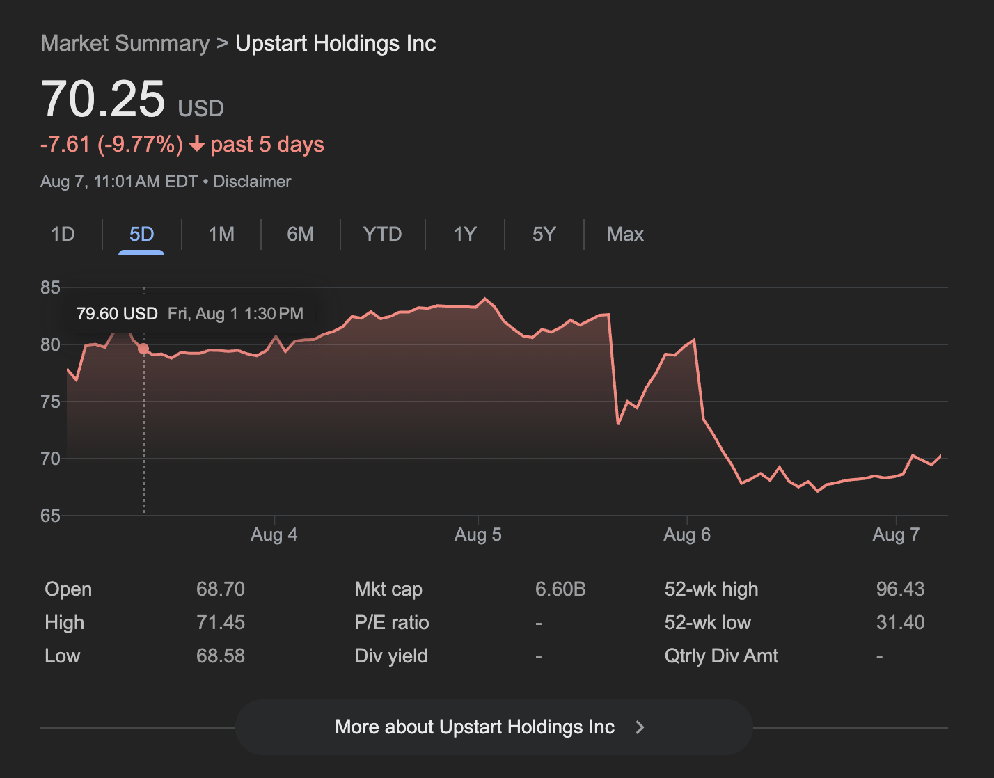 According, to MarketWatch, two things spooked investors: (1) Upstart holding more loans on balance sheet, while Wall St prefers they sell them off (2) Upstart cut their guidance on net interest income to $65MM for the full year, down from $90MM previously. [MarketWatch]